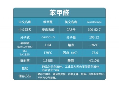 儲存方法 不穩定,容易被空氣氧化,在強堿性環境下,苯甲醛自身發生氧化還原反應而歧化。儲存于陰涼、通風的庫房。遠離火種、熱源。包裝要求密封,不可與空氣接觸。