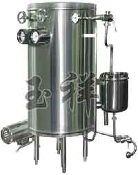 我廠RSCG系列超高溫瞬間滅菌機,在主機內裝著壓力容器-高溫桶,用作充盛壓力蒸汽。桶外的主要設置是螺旋形雙套管,用作對進、出物料的冷熱交換;桶內的主要設置時螺旋形單管,用作間接受熱。 物料的滅菌過程。物料通過供料泵進入雙套盤管的外層流道、由內層流出的熱料間接加熱而得到預熱,當物料進入設置在高溫桶內的高溫盤管時,由于桶內的蒸汽間接加熱而被加熱到需要的滅菌溫度,然后在桶外單旋管內保溫而使物料細菌被殺滅,當回到雙套盤管時,物料便進入內層流道,被外層冷料所冷卻,從而使出料溫度顯著下降(一般低于65℃)。如工藝上需要提高或降低出料溫度時,可啟用角式截止閥,讓它接通熱源(蒸汽)或冷源(水或冰水等)讓它們進入雙套管下端的外層流道。 節流閥是可以調節的,一方面讓物料維持在一定的壓力之下, 使其沸點溫度提高,以防止汽化:另一方面,也作調節流量用。物料最后經三通旋塞除料。該旋塞下端接著旋管,其出口將著貯槽,當需要時,可旋動旋管對準溢流管。進料三通旋塞的上端與貯槽接通,下端則與料源管道相連接。