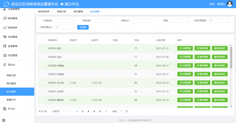 老人管理——老人的基礎資料、入住、合同、服務等管理