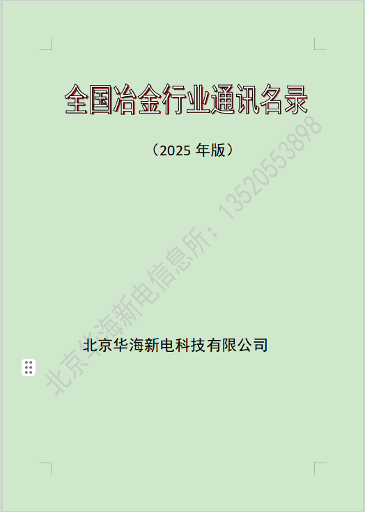 2025全國冶金行業(yè)(鋼廠鐵廠鋁廠有色金屬)通訊名錄,收錄了全國31個(gè)省市的金屬冶煉企業(yè)。主要包括黑色金屬冶煉及壓延加工業(yè)(鋼鐵廠)850家,銅冶煉企業(yè)350家,鋁冶煉企業(yè)410家,其他有色金屬冶煉300家,冶金礦山設(shè)計(jì)單位20多家。單位公司名錄信息包括:單位名稱、詳細(xì)地址、郵政編碼、企業(yè)法定代表人、聯(lián)系人、聯(lián)系電話、所屬行業(yè)、投產(chǎn)時(shí)間等。