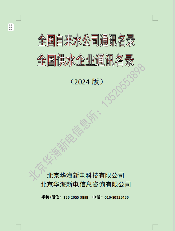 北京華海新電科技有限公司于2002年開始編纂《全國自來水廠通訊名錄》,到今年已經(jīng)走過了23個年頭,《全國自來水廠名錄》頁碼由當(dāng)初的200頁擴(kuò)編到現(xiàn)在的520頁。期間得到了廣大客戶的幫助,在此一一致謝。 《全國自來水廠名錄》收錄了2024年前投產(chǎn)的自來水廠3000余家。信息內(nèi)容包含:自來水廠名稱、法人、各科室聯(lián)系人、郵編、地址、處理工藝、投產(chǎn)時間、。