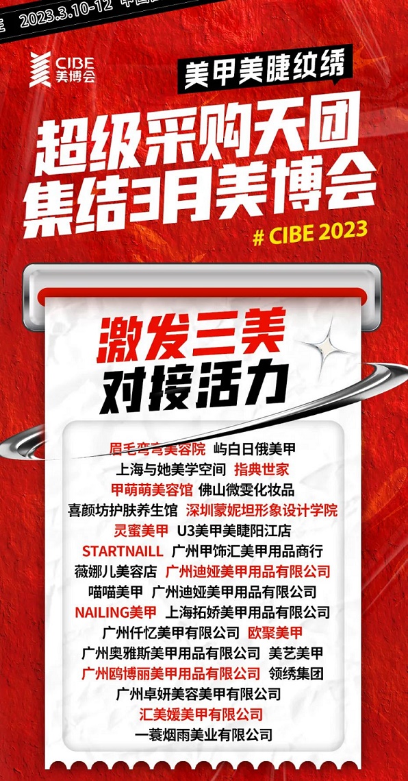 展商陣容**,專業(yè)買家組團(tuán)勢不可擋,來自全國20多個(gè)省市地區(qū)的代理商、經(jīng)銷商、美業(yè)連鎖機(jī)構(gòu)、美甲美睫門店、醫(yī)美機(jī)構(gòu)、美業(yè)培訓(xùn)學(xué)校、MCN機(jī)構(gòu)、社交電商、社群團(tuán)購等萬名買家已火熱集結(jié)。