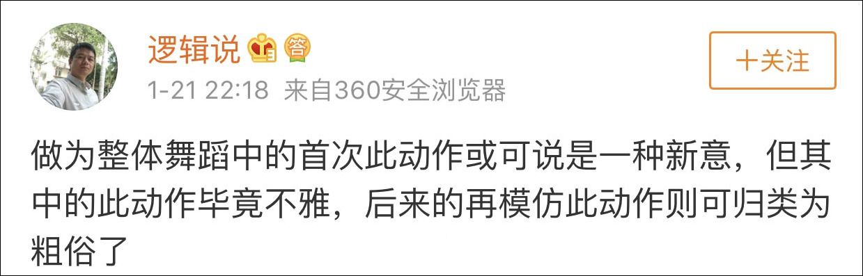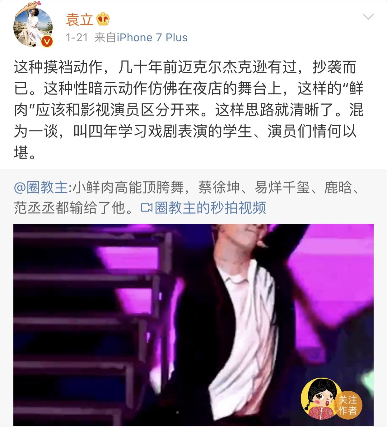 對標杰克遜的回答,21日晚,當袁立在微博上發出對頂胯行為的評價后,有網友認為袁立的說法太苛刻,頂胯只是舞蹈需要,只是每個人跳出來的風格有差異而已。