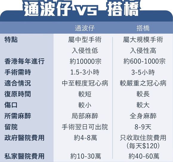 香港心臟專科醫生指,兩種手術技術不同,視乎病人的冠心病嚴重程度,中度至輕度的冠心病適合通波仔,嚴重的情況則適合做搭橋手術。在較復雜的情況,例如多條冠心血管非常狹窄等等,進行通波仔手術反而更有難度,而術后復發率亦較高,此時搭橋手術則更為合適。