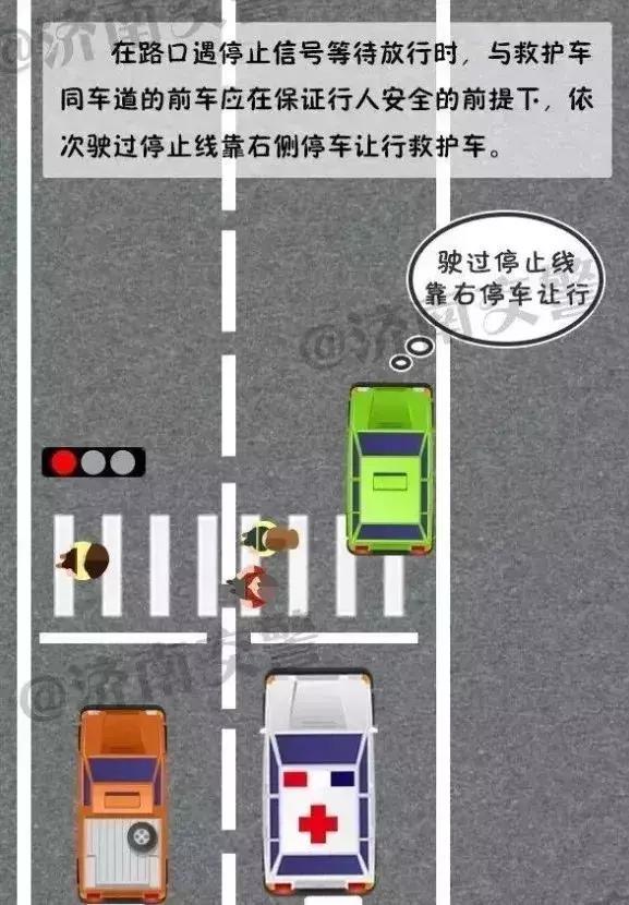 4、遇前方路口停止信號等待放行時,同車道內的前車應在保證行人安全的前提下,依次駛過停止線后靠右側停下,讓行急救車。
