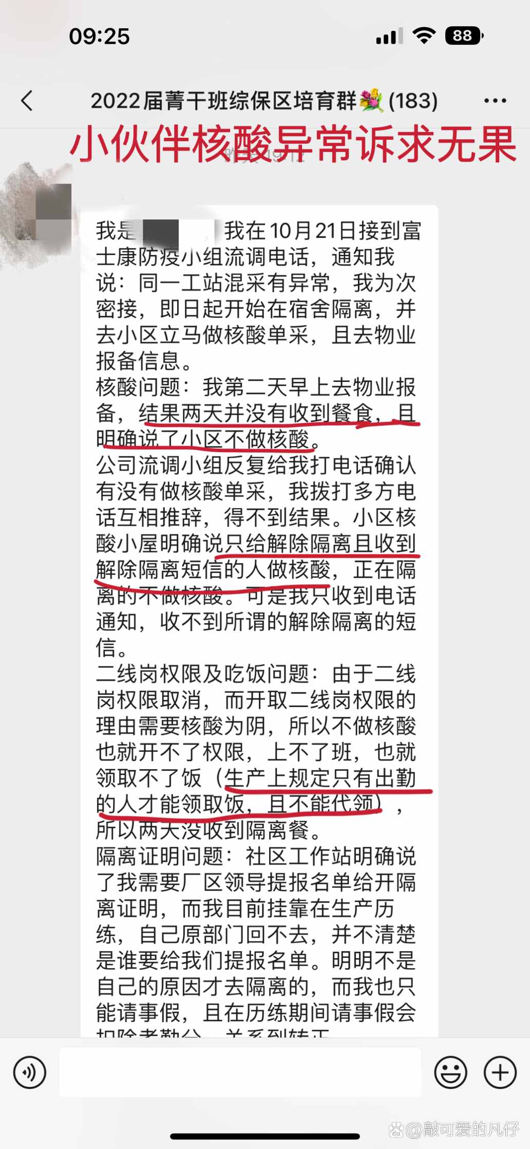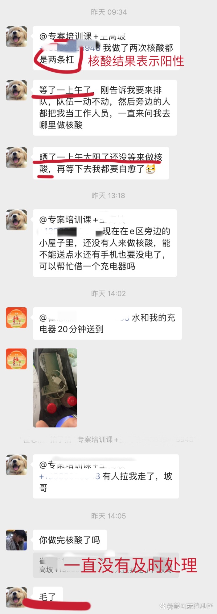 這么拖延和敷衍的處理方式,只會(huì)使事情變得更糟糕,果然,最不想看到的事情還是發(fā)生了,有一名菁干班成員抗原檢測(cè)兩次都為兩道杠。該成員曾經(jīng)在群里反映過(guò)自己的住宿問(wèn)題,無(wú)處可去,也表明自己身體不舒服,但是最后敷衍解決,在一個(gè)男寢打了地鋪。最無(wú)語(yǔ)的是他從上午都說(shuō)自己陽(yáng)性,直至下午都沒(méi)做上單采,到下午很晚的時(shí)候才被人拉走,拉走以后晚上也沒(méi)做上核酸。今天他們同宿舍的也有人抗原檢測(cè)出現(xiàn)了異常,不知道他們?cè)趺刺幚淼模抑恢浪麄兯奚嵊幸粋€(gè)人今晚住在了廠區(qū)倉(cāng)庫(kù)中。