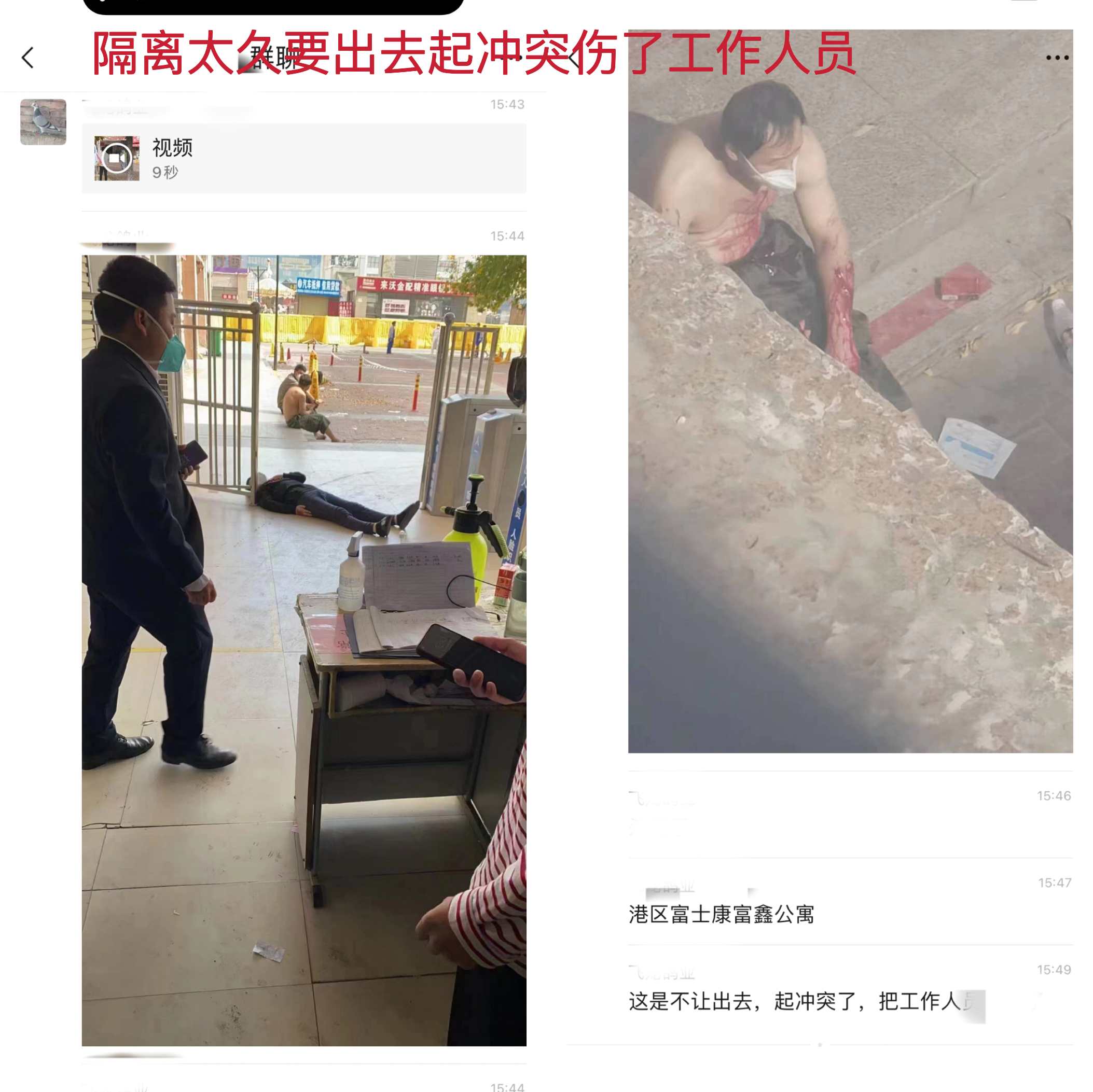 關(guān)于富士康疫情以來(lái)出現(xiàn)的一些負(fù)面新聞,包括富鑫公寓隔離人員因隔離太久要出去被工作人員攔下,因此起了沖突將工作人員捅傷、某小區(qū)有被隔離者試圖用床單出去從高樓摔下去、大量陽(yáng)性病例哄搶物資等事件,我都看到過(guò)相關(guān)視頻,且不說(shuō)視頻真假,能將人逼到如此境地,相信也是經(jīng)歷了很大的絕望。
