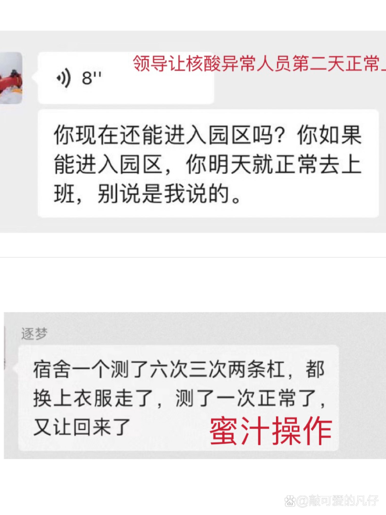 這周疫情尤為嚴(yán)重,有小組待的車間出現(xiàn)了混管陽(yáng)性,由于每個(gè)車間核酸點(diǎn)都是固定的,那么說(shuō)明該車間內(nèi)必有陽(yáng)性。出現(xiàn)陽(yáng)性病例之后,該小組很害怕,不敢進(jìn)車間上班了,但是管我們的領(lǐng)導(dǎo)依然強(qiáng)烈要求要進(jìn)入車間,繼續(xù)定崗定位。他們聽了領(lǐng)導(dǎo)的話,緊接著,他們的核酸也出現(xiàn)了異常。我們聽到這個(gè)消息,感覺(jué)都很慌張,第一次感覺(jué)疫情離我們這么這么近。可是出現(xiàn)異常的人員并沒(méi)有被拉走,而是一直待在宿舍,等了好幾天也沒(méi)有人上門單采。再然后,菁干班出現(xiàn)核酸異常的人員越來(lái)越多,混陽(yáng)人員不止個(gè)例,但是這時(shí)候的處理方式直接是放任不管,可以正常上班,甚至有的密接者沒(méi)有去處,無(wú)家可歸,沒(méi)人管,向領(lǐng)導(dǎo)反映,也很久才進(jìn)行安排,最終在男寢一個(gè)宿舍打了地鋪。