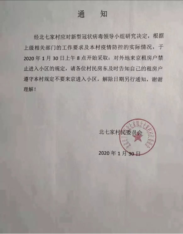 1月31日,北京市政府發(fā)文稱,“除必需行業(yè)外,各企業(yè)2月10日上班”,將迫在眉睫的返京大潮又往后推遲一個禮拜。只不過,這個文件仍然為企業(yè)要求員工返京彈性工作留有余地。已經(jīng)回京的上班族,已有不少人已經(jīng)在外流浪數(shù)日。陸續(xù)有北七家等地的房客被租住小區(qū)拒之門外,據(jù)不完全統(tǒng)計,這些小區(qū)當(dāng)中的大多數(shù)都由村委會管理,這類強調(diào)“村民自治”的小區(qū),自認為在社區(qū)管理層面有較大的自由度。他們對房客提出了要求,“自行在外隔離14天”,“14天后出示三甲醫(yī)院出具的健康證明”
