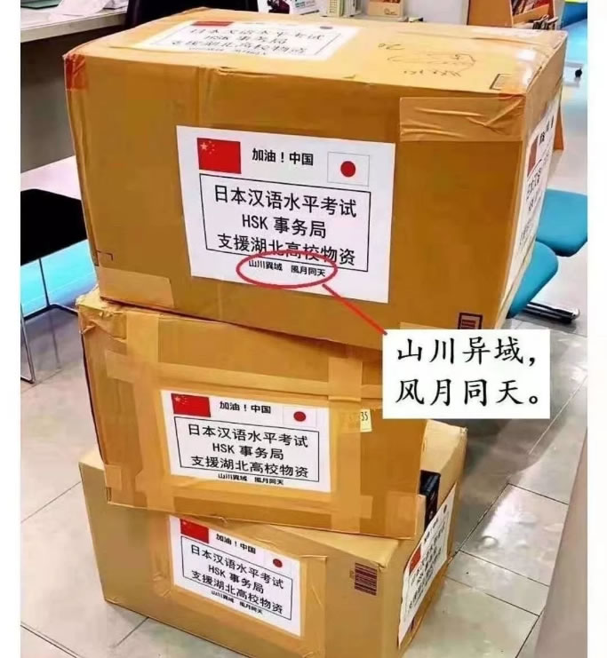 剛才在微博上看到一張照片,拍的是捐給武漢的三箱物資,上面貼了張標(biāo)簽,“日本漢語水平考試考試HSK事務(wù)局支援湖北高校物資”,上面還有一行字,寫著“加油!中國”,下面還有一行小字,“山川異域,風(fēng)月同天”。這兩個詞突然就擊中了我,它們似乎傳達出來的美好情感和復(fù)雜情緒,讓處在眼下境地中的我,愣了好一會兒。