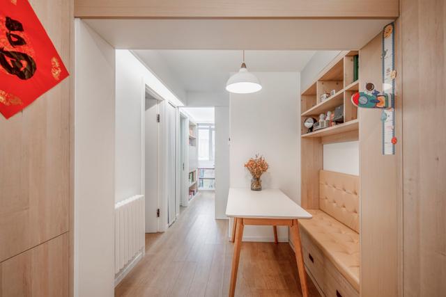 原戶型進門并沒有一塊合理的收納區(qū),所以在改造時,就利用廚房的墻體隔斷,改造出了一組日常鞋柜,以解決基本的收納需求。