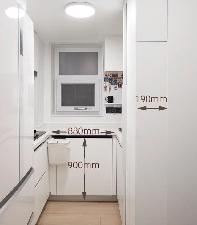 櫥柜做U型結構布局,中間預留88cm寬轉身空間,操作時不會感到擁擠。同時,還實現(xiàn)了人性化的洗-切-炒烹飪動線。