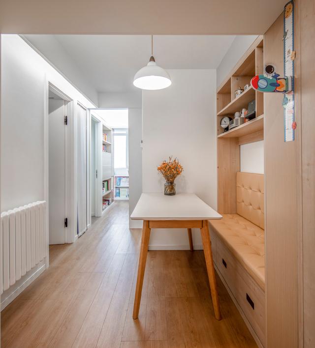 利用臥室空間內退規(guī)劃出的客餐廳,做了卡座布局,雖說面積僅有2㎡,但也滿足了一家四口用餐互動的需求,并且十分溫馨。