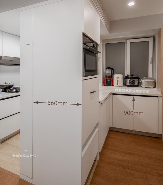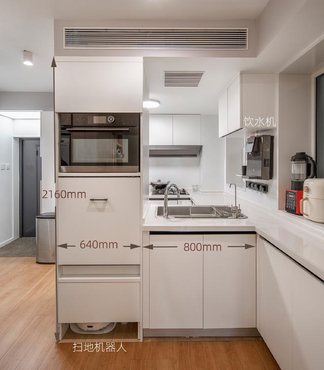 兩塊空間之間增加高柜隔斷,滿足烤箱、洗碗機、掃地機器人收納。而像這種“精打細算”式的結構規(guī)劃,也最大化提升了空間收納率。