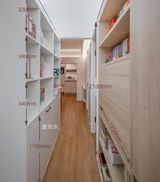 不僅如此,左側柜體底部內嵌墨菲床,展開后還能當作一張單人床使用。這樣一來,即便長輩偶爾過來,也能滿足全家人的居住需求。