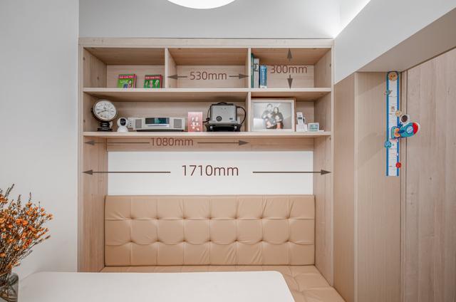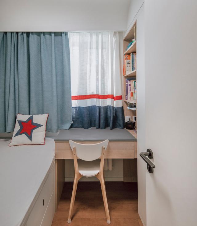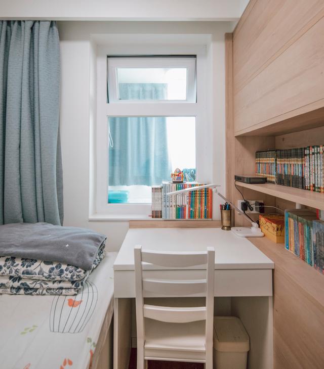 弟弟房間的布局,基本上與哥哥房間一樣。同時,兩個房間之間用柜體+窗戶隔斷,也保留下了一定的通風采光環(huán)境。