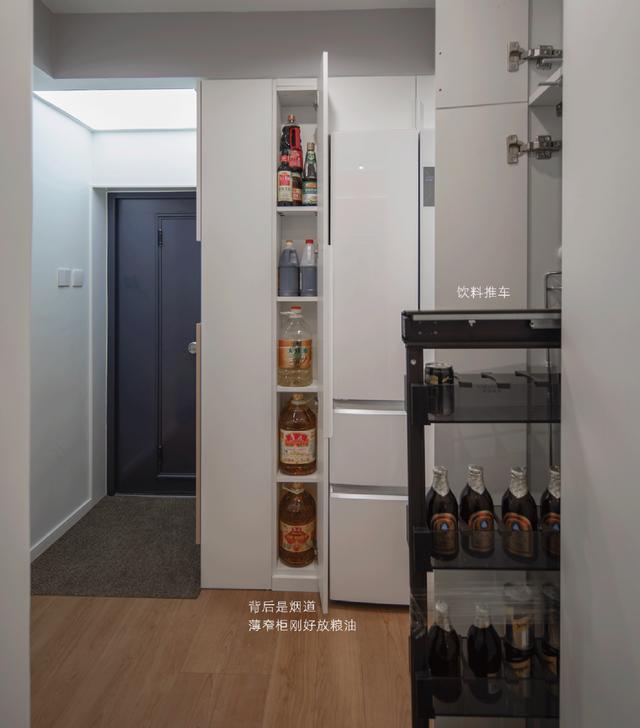 除此之外,利用煙道與鞋柜之間的內陷空間,設計一個24cm的薄柜,剛好可以用來存放糧油,并隱藏了煙道,讓空間更具整體感。