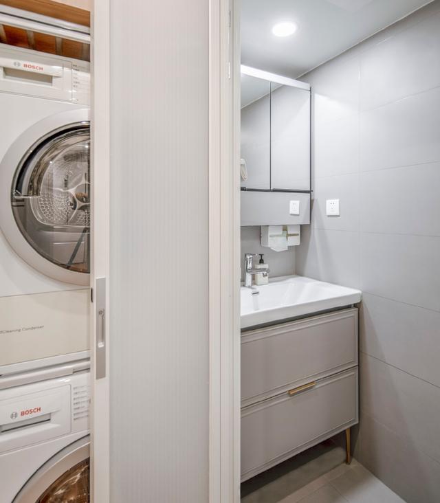 雖說內部僅增加了馬桶和洗漱,但也有效優(yōu)化了生活效率。除此之外,門外一體的家政柜設計,也讓洗烘設備和清潔工具得到了有序收納。