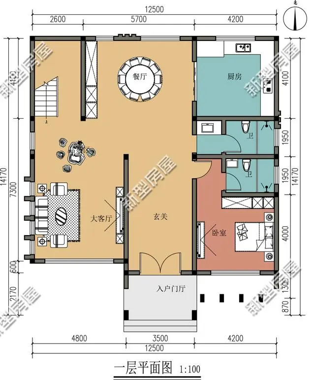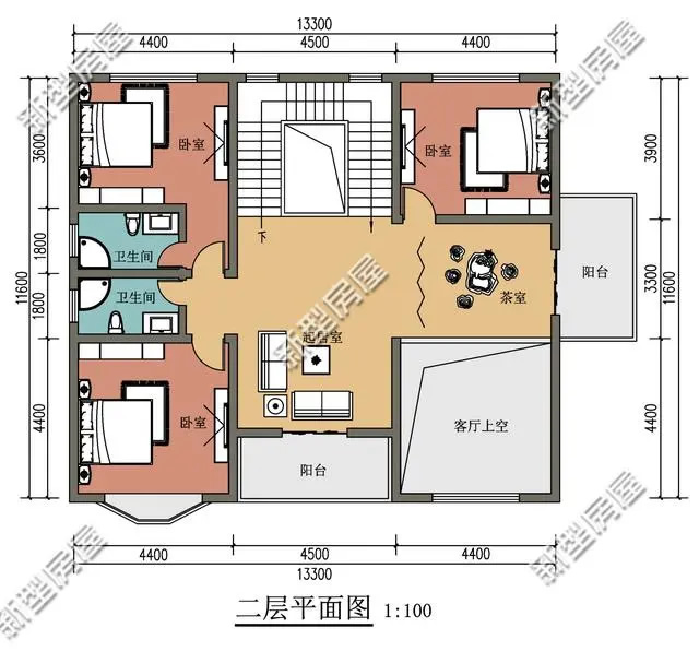 第4套:雙入戶門+觀景露臺+多臥室,9×14米新中式戶型,主體預算30萬