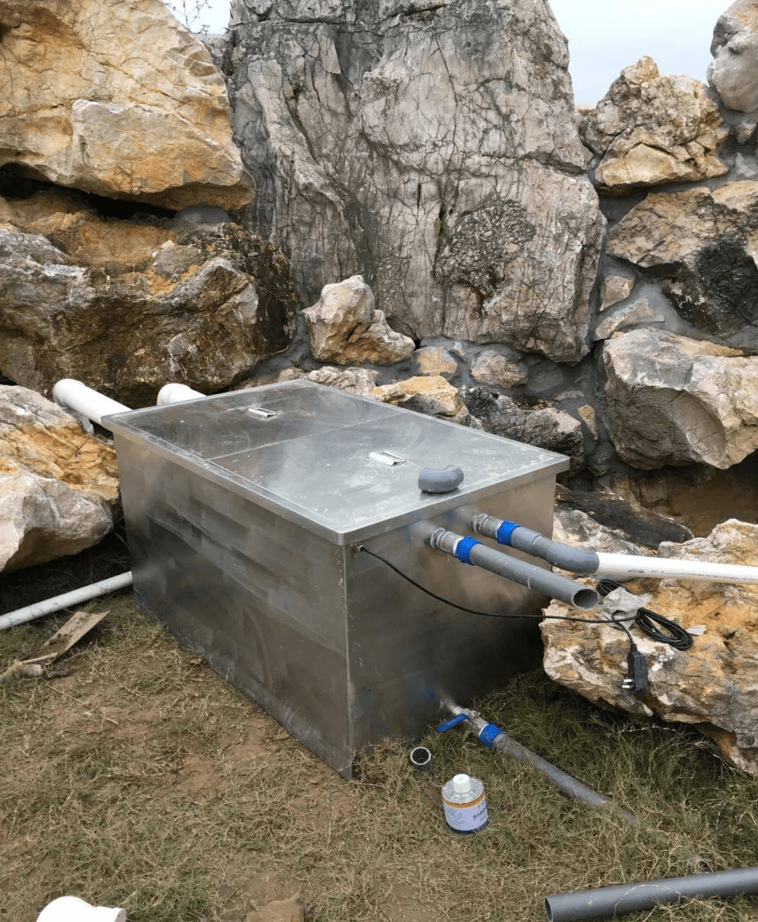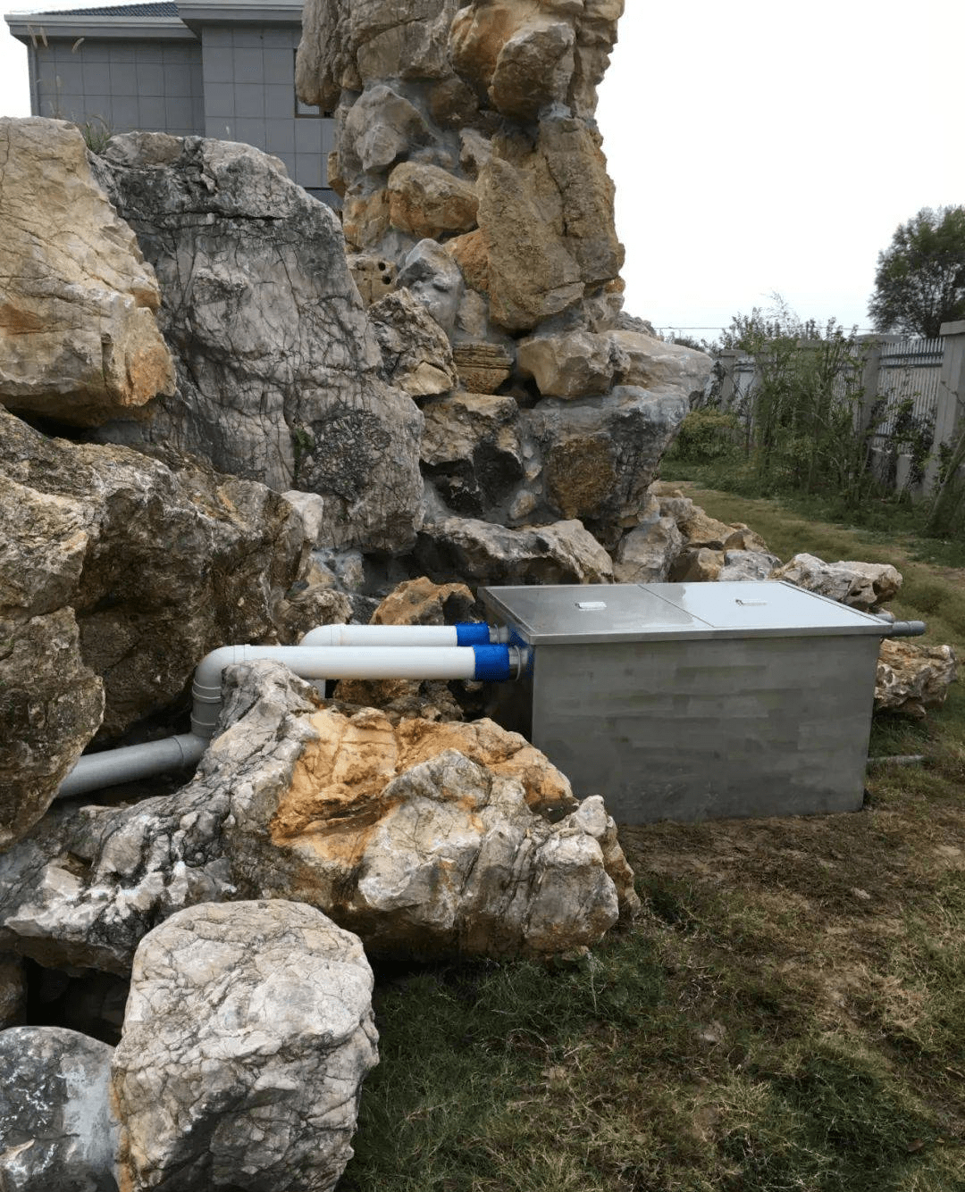 經(jīng)過前期現(xiàn)場(chǎng)勘察,項(xiàng)目水景系新建水池,后方有假山造景。設(shè)計(jì)工程師制定優(yōu)化方案:安裝智能一體化魚池過濾器OSA-FT100000一套,隱藏式安裝于假山后面。