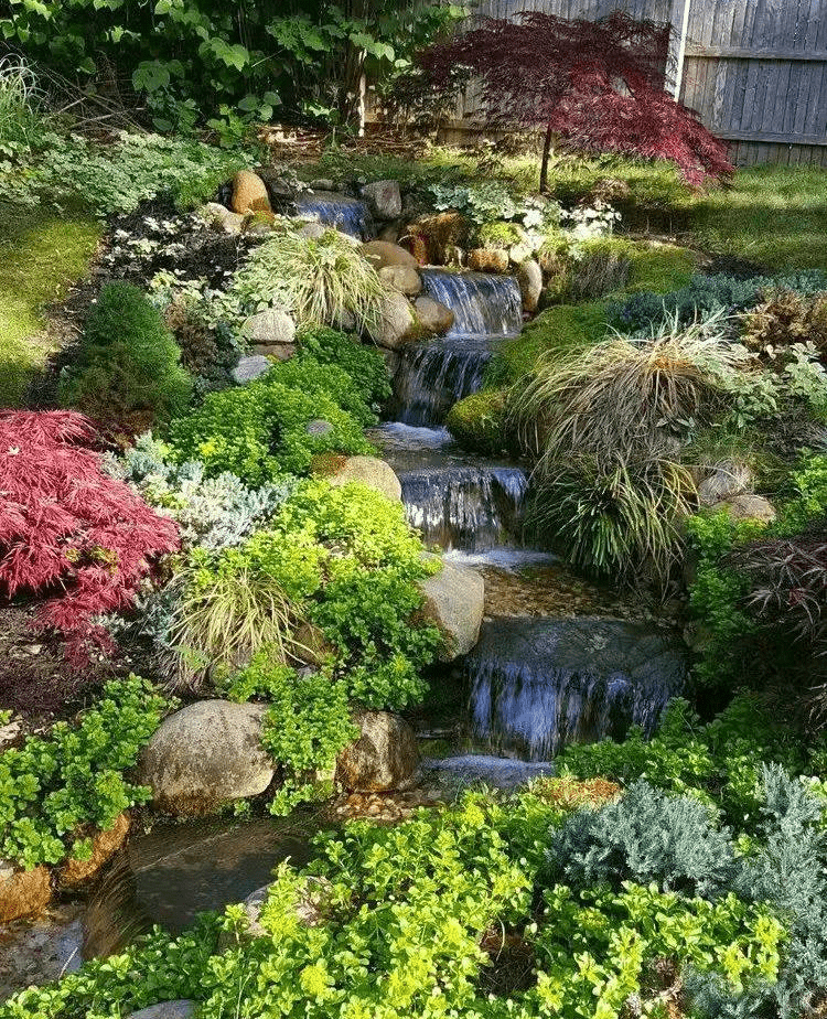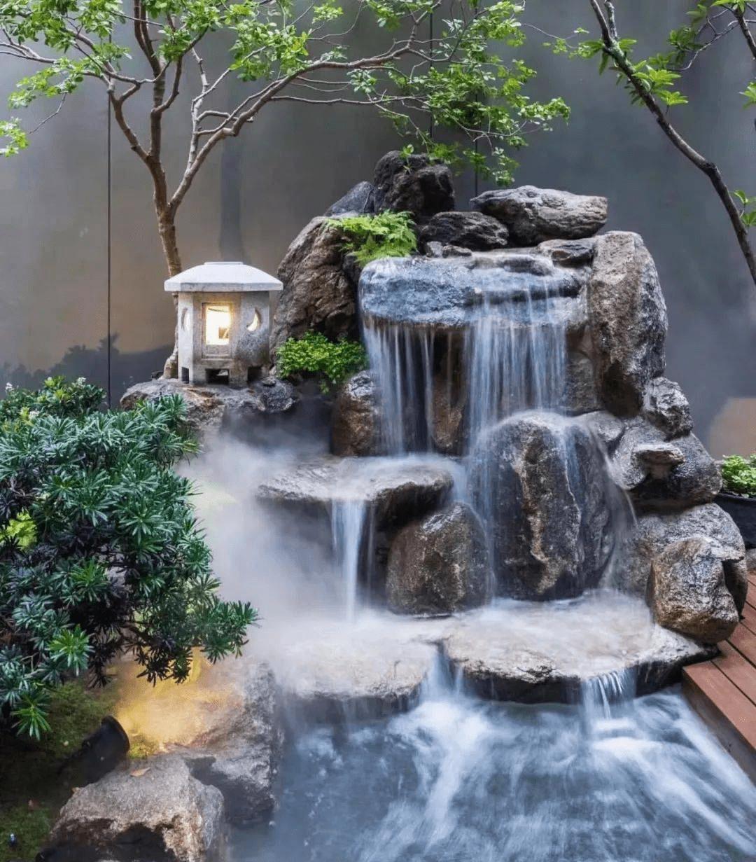 瀑布主要是利用地形高差和砌石形成的小型人工瀑布,借以改善景觀。瀑布跌落有很多形式,日本園林把瀑布分為 “ 向落、片落、傳落、離落、棱落、絲落、左右落、橫落 ”等十種形式。