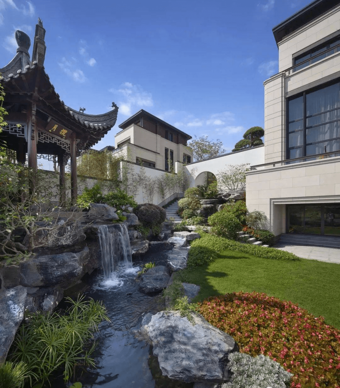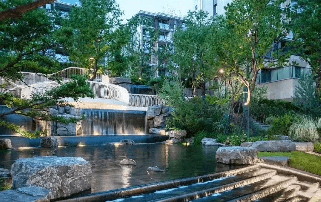溪流是提取了山水園林中溪澗景色的精華,再現(xiàn)于城市園林之中,居住區(qū)里的溪澗是回歸自然的真實(shí)寫(xiě)照。小徑曲折多次,溪水忽隱忽明,因落差而造成的流水聲音,丁冬做響,人達(dá)到了仿佛親臨自然的境界。