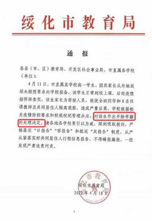 2022年4月19日,網上流傳一張落款為“綏化市教育局”的通報。通報稱,4月11日,綏化市直屬一學校高一學生,因其家長從外地返綏未按要求向學校報備,對該生做出開除學籍的處理決定。該通報立即在網上引起了熱議。