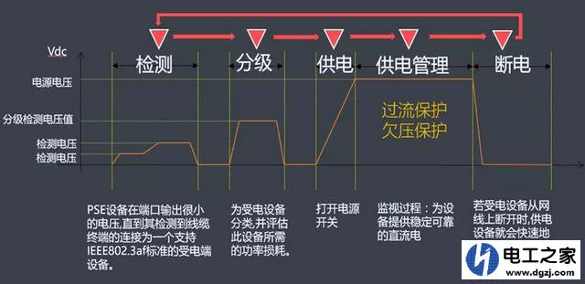 標(biāo)準(zhǔn)POE交換機(jī)供電內(nèi)部有POE控制芯片,支持802.3af,802.3at,802.3bt協(xié)議,并能輸出15.4W,30W,90W的功率,在供電時(shí)有檢測(cè)、分級(jí)、供電、供電管理、斷電等5個(gè)過(guò)程,當(dāng)鏈路中有設(shè)備連接,國(guó)標(biāo)POE交換機(jī)首先會(huì)先向網(wǎng)絡(luò)中發(fā)送一個(gè)信號(hào),檢測(cè)網(wǎng)絡(luò)中的終端是否支持POE的受電設(shè)備,支持就供電,不支持就不會(huì)供電;