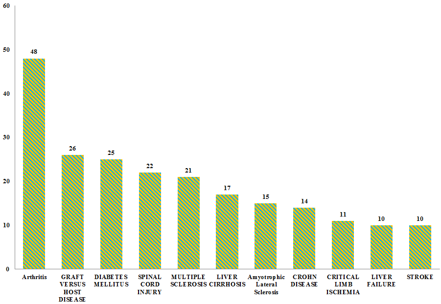 其中關(guān)節(jié)炎48項(xiàng),移植物抗宿主病26項(xiàng),糖尿病25項(xiàng),脊髓損傷22項(xiàng),多發(fā)性硬化21項(xiàng),肝硬化17項(xiàng),肌萎縮性脊髓側(cè)索硬化癥15項(xiàng),克羅恩病14項(xiàng),