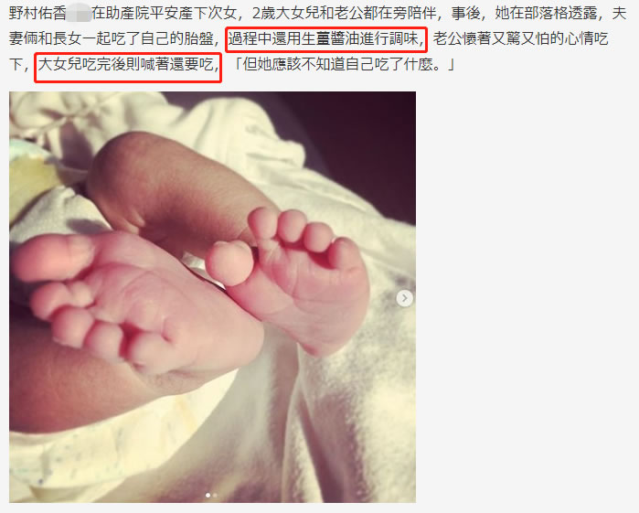 但沒想到這位外表看起來柔弱美麗的女星,居然做了一件驚掉人下巴的事情。據臺媒報道,野村佑香在醫院產下二胎女兒之后,竟然和老公、大女兒一起將二女兒的胎盤分而食之,這種毀三觀的行為自然引起了一片聲討。