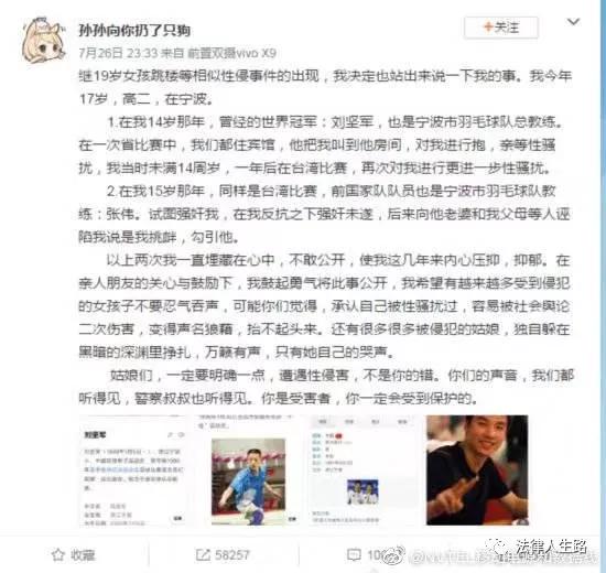 2018年7月,隨著#Metoo運(yùn)動(dòng)對(duì)「性騷擾」的喚醒,一名17歲寧波女孩發(fā)長(zhǎng)文稱,曾遭到兩名羽毛球教練侵犯,其中一名曾是國(guó)家隊(duì)隊(duì)員,另一名還是世界冠軍。