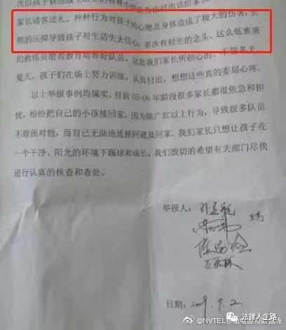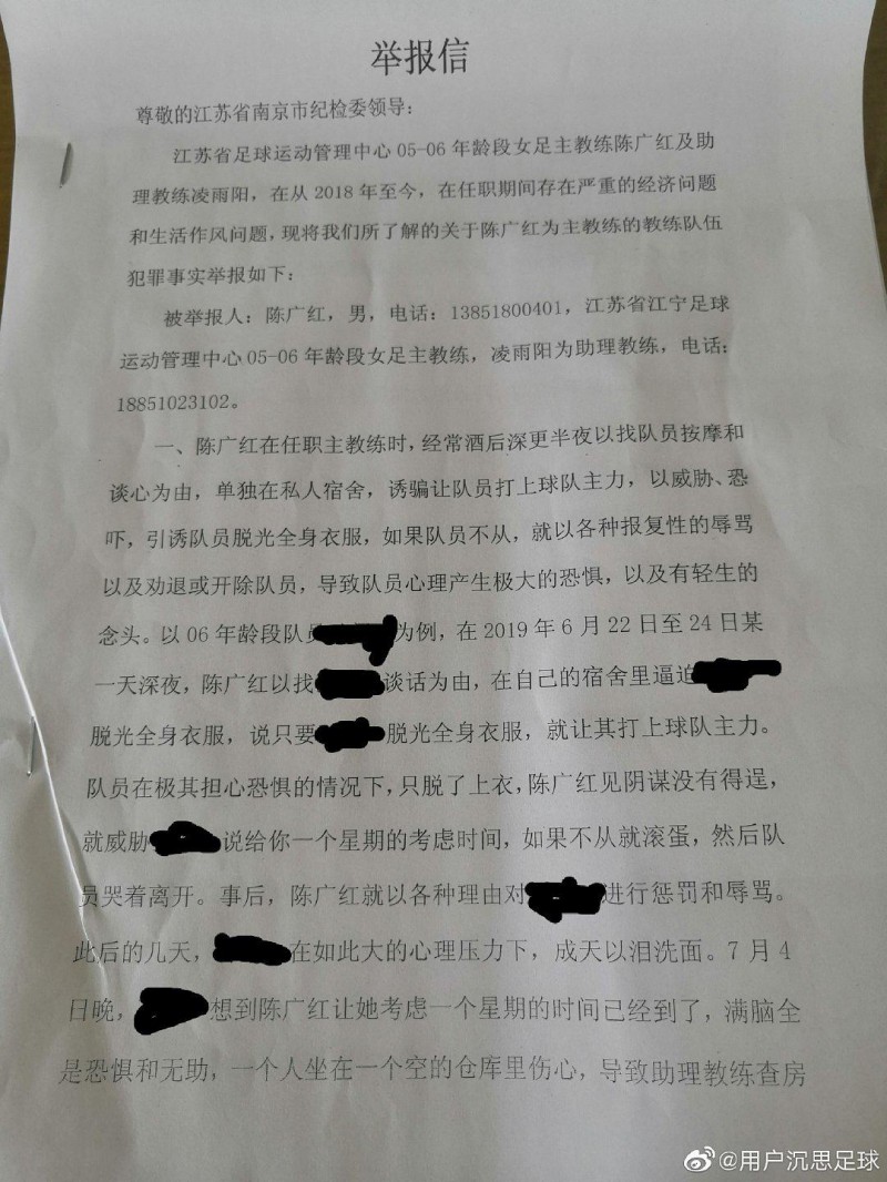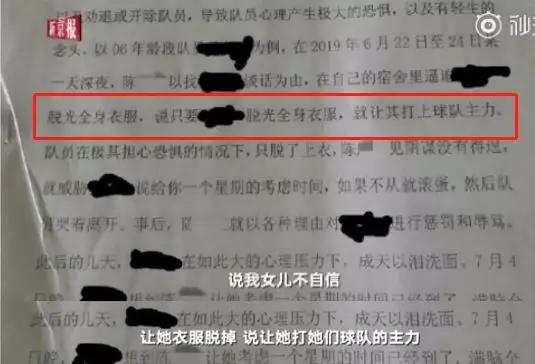 “陳廣紅在任職教練時(shí),經(jīng)常酒后深更半夜以找隊(duì)員按摩和談心為由,單獨(dú)在私人宿舍,誘騙讓隊(duì)員打上主力, 以威脅恐嚇,引誘球員脫光全身衣服,如果隊(duì)員不從,就以各種報(bào)復(fù)性的辱罵以及勸退或開除隊(duì)員, 導(dǎo)致隊(duì)員的心理產(chǎn)生極大恐懼,以及有輕生的念頭。”