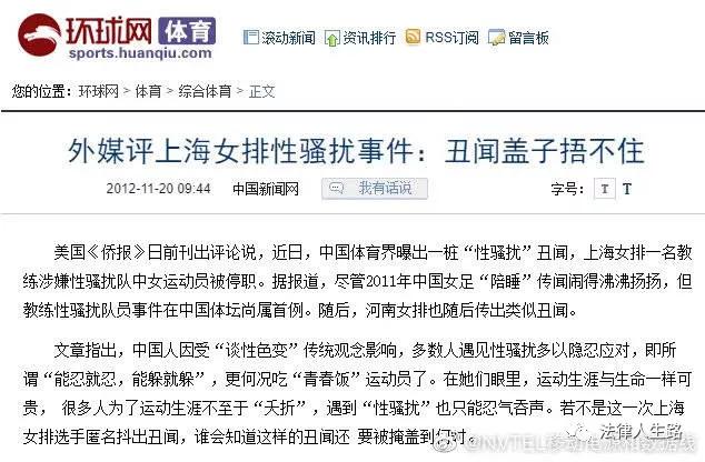 2012年11月上海女排曝出性騷擾丑聞,副教練辛某以按摩之名觸摸隊(duì)員敏感部位,卻只遭到了開除出隊(duì)的處罰。
