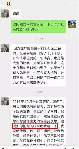 陳廣紅曾在2016年12月某晚酒后將自己叫到房間聊天,以“坐穩(wěn)主力位置”為誘,要求自己裸露胸部。