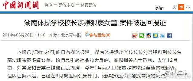 2013年12月,湖南省體操運(yùn)動(dòng)學(xué)校校長(zhǎng)劉某及副校長(zhǎng)曾某涉嫌性侵6名女童并被拘捕,但該案時(shí)隔4個(gè)多月才被曝出,2014年3月,又因證據(jù)不足,檢察機(jī)關(guān)將案件退回公安部門繼續(xù)搜證。 這座曾被評(píng)為“全省文明標(biāo)兵單位”的體操學(xué)校培養(yǎng)出了李小鵬、劉璇等多位世界冠軍。校長(zhǎng)劉某任職期間猥褻了6名在校的未成年兒童,在當(dāng)時(shí)被稱作中國(guó)版的熔爐。