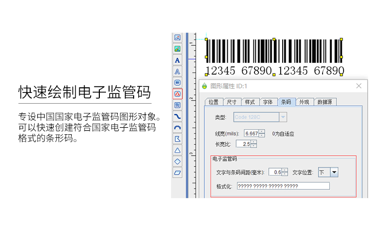 可以繪制矩形、(橢)圓形、三角形、多邊形、線段、曲線、文字等多達15種圖形對象;圖形可隨意拉伸、壓縮、旋轉等;封閉式圖形支持漸變色、背景圖案等填充方式;圖形尺寸、位置、旋轉角度可精細化設置;數據類圖形支持數據的批量生成或導入;圖形編輯支持對齊、等間距等常規圖像處理方法。