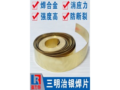 三明治銀焊片,復合銀焊片,補償銀焊片/夾心銀焊片的牌號是:BAg50M。是一種含50%銀銅鋅錳的銀基釬焊材料,固液相線:660~740℃,建議最低釬焊溫度:780℃。是一種兩片銀釬料片中間加有銅墊片或鎳墊片的特殊焊片,也就是加有補償墊片的銀焊片。主要應用于釬焊焊縫長度超過12.7mm的合金,硬質合金或者大面積釬焊面的工件,以防止因異種金屬間焊接其熱膨脹系數不同而產生的開裂現象。焊接時需添加助焊劑,如銀焊粉、銀焊膏等,且焊前需對工件進行除油除銹處理,焊接時注意保持良好通風。廣泛運用于各種硬質合金刀具,車刀,鉆具,礦山釬具的釬焊。圈裝帶材,寬度可訂制裁切。