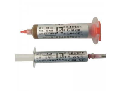 膏狀銀焊料,膏狀銀釬焊料,銀焊膏、銀釬焊膏、釬焊膏公司牌號是:HG-45。是一種由超細銀合金粉末、助焊劑、粘結劑組成的膏狀銀釬焊料。固液相線:665~745℃,建議最低釬焊溫度:760℃。是銀銅鋅系列的產品,適用于復雜焊點、精細焊點、密集焊點等各種黑色金屬及除鋁鎂外金屬工件的釬焊,采用火焰釬焊,高頻釬焊,電阻釬焊,爐中釬焊等都行,焊接時無需添加助焊劑,但焊前需對工件進行除油除銹處理。廣泛運用于精密儀器、大功率發電機,水輪機,航空發動機等產品。配合自動點膏機、自動釬焊機,可以實現高效率規?;a。釬焊是個系統工程,因涉及到釬料的匹配性,請親們下單前先通過旺旺咨詢我們店主,以便為您遴選更適用和經濟性的產品。