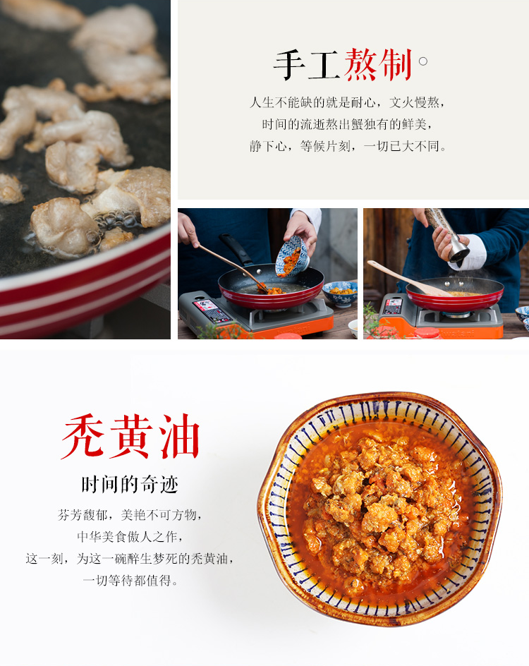 蟹囧™禿黃油的鮮美濃郁如此極致,幾乎任何菜式在它旁邊都會黯然失色。相比之下,蟹囧™禿黃油最正宗的吃法,是與熱騰騰的米飯以1:1的量均勻拌開,這樣才能化開凝固的油脂。舀一勺金黃色的禿黃油,輕輕一攪,每一粒飯都泛著金黃的亮光,平平無奇的一碗白飯便成了美食的至高享受。