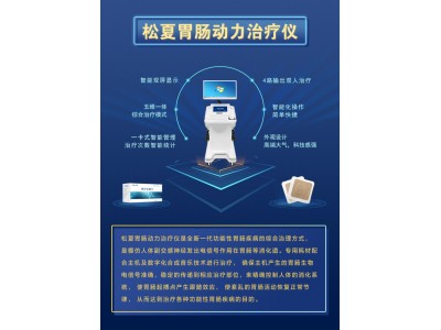 河南松夏醫電技術有限公司生產的胃腸動力治療儀提取健康人體的胃腸電信息,采用頻率合成技術合成胃腸起搏的治療波形作用于腹部體表,能有效地驅動胃腸起搏點,促使患者不正常的胃腸電節律正常化,達到治療胃腸動力障礙性疾病的目的。