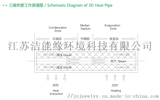 三維熱管不需要動力,沒有額外消耗能量,節能效率高;水平放置可以進行雙向傳熱,無需傾斜放置,無需季節轉換裝置。