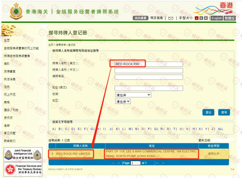 下圖是 Red Rock Pay 在香港海關(guān)的注冊記錄,MSO牌照號碼為 18-11-02612.