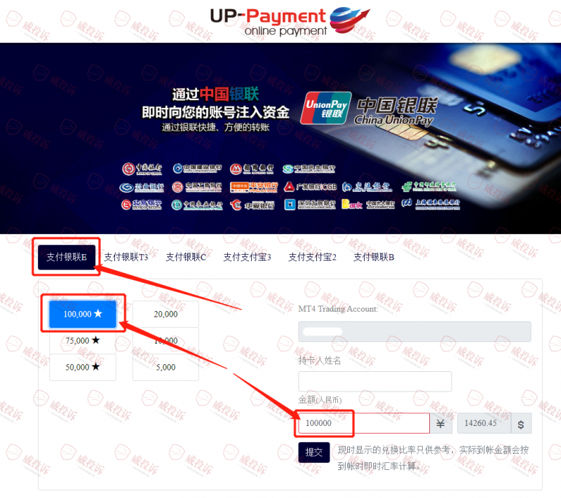 且看下圖,支付通道E (Easy Pay)可以一次經(jīng)個人轉(zhuǎn)賬的方式入10萬人民幣,每天沒有次數(shù)限制,雖然現(xiàn)在國家是在嚴(yán)打非法資金,正所謂道高一尺,魔高一丈,許多無知的投資者把大筆的資金轉(zhuǎn)入到非法炒匯平臺,等發(fā)現(xiàn)受騙上當(dāng)之后才來維權(quán)立案,往往都是為時已晚。