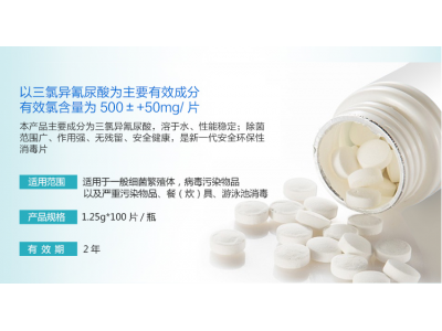 產(chǎn)品說明:本品是以三氯異氰尿酸為主要有效成分的消毒片,有效氯含量為36%-44%,可殺滅腸道致病菌和化膿性球菌。