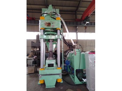 :由上下橫梁、液壓缸總成、加料缸、模具、料斗、充液總成等組成。上下橫梁由立柱和螺母聯接,主液壓缸前端用法蘭聯接在橫梁底部,模具固定在下橫梁上,模套固定在模具內,沖頭直接聯接在油缸活塞桿頂端,模套和沖頭均可拆卸和更換。有一抽板缸位于主機下模具后面,抽板缸前位時與模套形成模腔底部,后位時底部形成空間,利于餅塊落下,同時具有推餅出模具底部的功能。加料缸和加料斗組成自動加料機構,機器的加料由加料缸的往復動作完成。充液系統位于橫梁側面,以補充主油缸快速前進所需的油液。