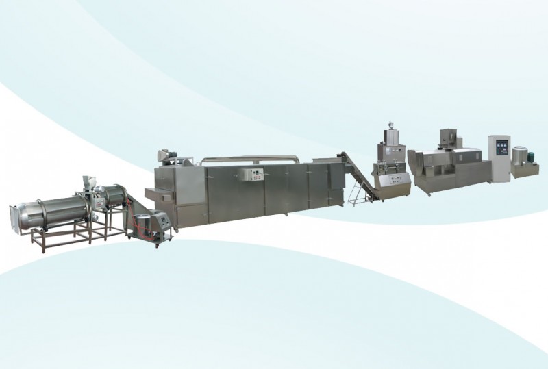在擠壓膨化加工過(guò)程中,物料置于裝有螺桿(主軸)的密封機(jī)筒內(nèi),隨著相互嚙合的兩螺桿的強(qiáng)制推進(jìn),因受機(jī)械的壓延,物料內(nèi)部的剪切力以及來(lái)自機(jī)筒外部的熱能,使物料處于高溫(溫度可達(dá)150~200℃);又因?yàn)槲锪鲜翘幱诿芊鉅顟B(tài)下,隨著密封容積的變化及溫度的升高而產(chǎn)生高壓(壓力可達(dá)10kg/cm²以上),使物料逐漸變成熱流變體的凝膠狀態(tài),并獲得大量的能量,改變?cè)械奈锢怼⒒瘜W(xué)屬性。當(dāng)物料經(jīng)模頭擠出進(jìn)入常溫常壓狀態(tài)時(shí),就朝著混亂度增大(即熵值增加)的方向進(jìn)行。這樣不僅使物料的體積增大,有利于各種酶的作用,而且淀粉、蛋白質(zhì)等營(yíng)養(yǎng)成分都發(fā)生了不同程度的降解,可溶成分增加。使蛋白質(zhì)分子由球形變成鏈狀,并重新組織化,具有有肉感的纖維狀態(tài)。