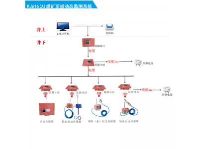 系統(tǒng)由監(jiān)測(cè)主備機(jī)、打印機(jī)、不間斷電源、電源防雷器、RS485/USB轉(zhuǎn)換器、KJ616(A)-J礦用本安型數(shù)據(jù)傳輸接口(以下簡(jiǎn)稱接口)、KJ616(A)-F1礦用本安型傳輸主站(以下簡(jiǎn)稱主站)、KJ616(A)-F2礦用本安型監(jiān)測(cè)分站(以下簡(jiǎn)稱分站)、傳感器、KDW28-18(A)礦用隔爆兼本安不間斷電源及線纜等設(shè)備組成。