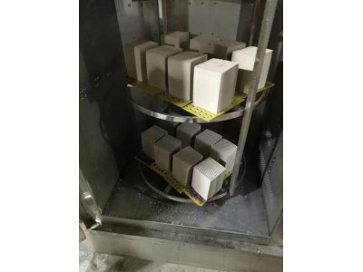⑴加熱腔為八面體(用不銹鋼制造),微波從其中六個面上均勻地 饋入,轉盤及被煅燒的物料大致處于腔體中間位置,轉速每分鐘約1.5轉。