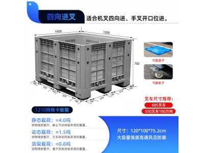 供應拉薩1210網面卡板箱一體式箱式托盤,卡板箱是在塑料托盤的基礎上,以底部托盤加上部箱體制作成的大型裝載周轉箱,適用工廠周轉,產品儲存。主要應用各種零部件和原料的包裝,儲存和運輸,汽車零部件,衣服面料,蔬菜等集裝化包裝,是一款應用廣泛的物流容器。