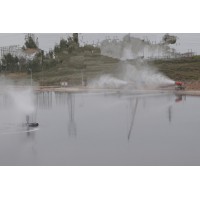 蒸發(fā)塘噴霧機,電動機通過支撐柱安裝在浮臺上,電動機的動力輸出軸上設置有扇片,增壓水泵固定在浮臺下方,電動機外壁上固定有噴水裝置,增壓水泵通過水管與噴水裝置相連通,噴水裝置的出水口位于扇片的下方。本實用新型的有益效果在于:1、采用增壓水泵供水,噴水裝置的出水口位于扇片的下方,在扇片的作用下,水與外界環(huán)境接觸時間長,蒸發(fā)效果好。2、工程投資低、操作管理簡單、安裝拆卸方便、占地面積省等特點,可完全彌補自然蒸發(fā)塘的缺點。3、安裝在蒸發(fā)塘上,起到加強蒸發(fā)的作用,可增強蒸發(fā)效果14~30倍,蒸發(fā)同樣的廢水所需蒸發(fā)塘面積可降低到原來的1/10。
